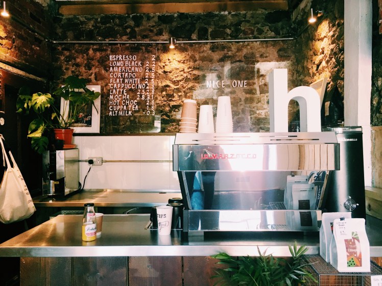 Holmeside was set up six years ago and traded inside a nightclub. This changed last year when their undoubted taste for coffee and atmosphere moved into the museum – this has now become their main cafe which is just outside the town centre. But to my eyes, this one is the real jewel on High Street West, which opened only a few months ago. The cafe is small: no seating, comfortable for about 4 customers at a time, but what it lacks in space, it makes up in character – the walls were stripped down, revealing old stone walls and a door not used for 30 years – and you can’t help but be charmed by the place, and the experience.