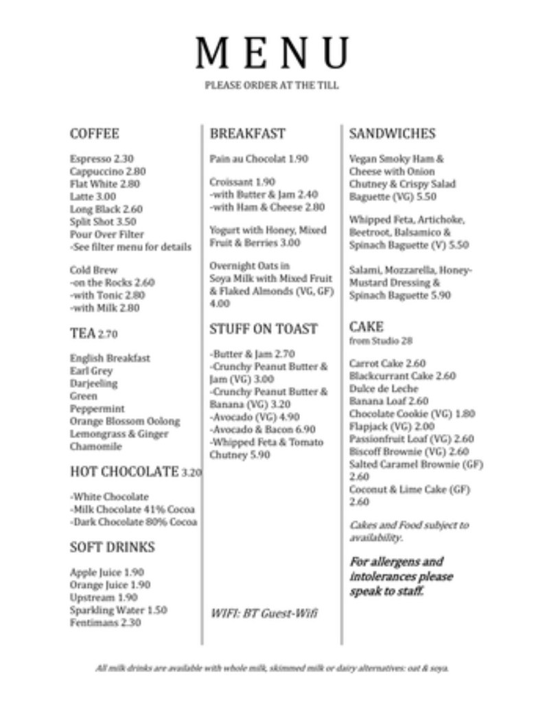 It wouldn’t be complete without a touch of avocado somewhere. Thankfully, they do breakfast, ‘stuff on toast’ (note, no eggs), and sandwiches. Go for some overnight oats, some avocado and bacon on toast, or one of their majestic sandwiches (whipped feta, artichoke, beetroot, balsamic and spinach baguette anyone?) Fresh cakes and pastries sit vying for your attention, and little treats like specialty chocolate are great options for quick pick-me-ups.
