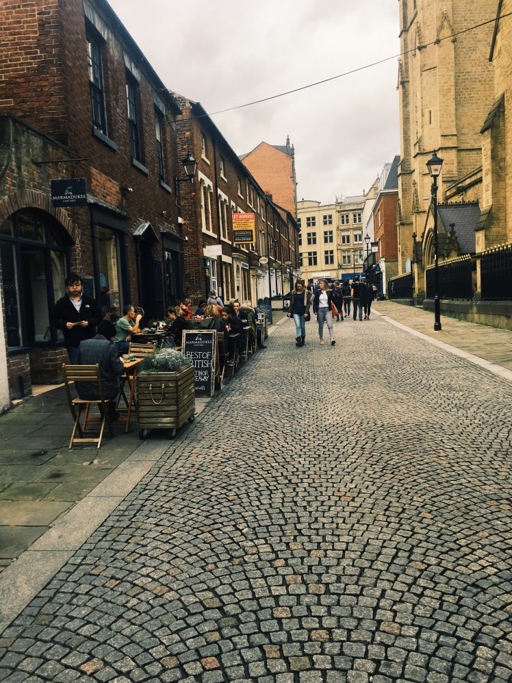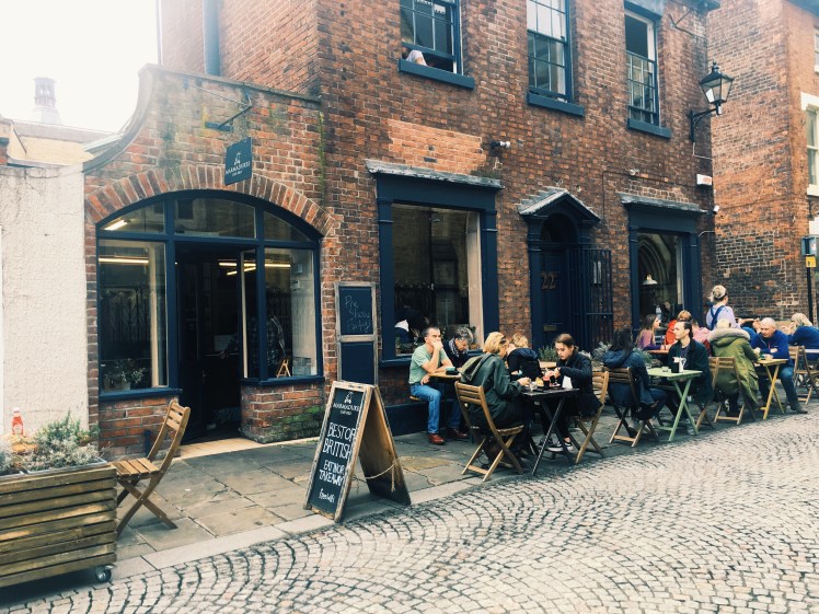 I asked a number of people for coffee shop recommendations in Sheffield and I got this reply every time: Marmadukes. As soon as I walked in you can see why. A warm, welcoming hug of a cafe. Chic wooden tables outside on the cobbled pedestrian walkway, and inside, if you follow the corridor past the counter, you’ll find yourself going through what feels like a rustic, ambient labyrinth into a coffee shop haven: thick, rustic wooden tables (choose between big sharing ones or smaller ones), cushions everywhere, great coffee shop-related reading material and a comfortable, cosy atmosphere that makes you feel like you’re in your own home and not in a public space at all.